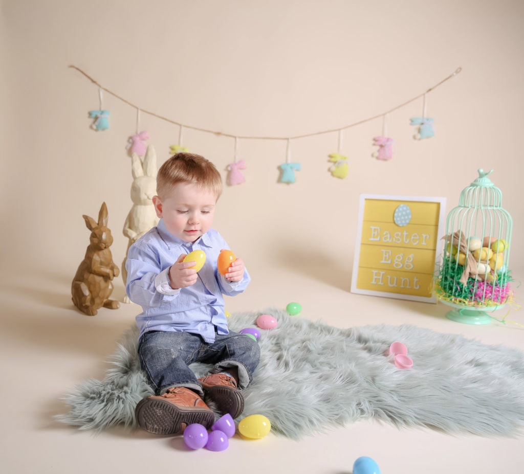 Easter Mini Session at Grey Loft Studio who is a Family Photographer in Ottawa. This year, document your little one(s) gathering Easter eggs in and around the wooden bunnies. Watch as they light up once they have collected all the magical eggs. Capture all the little smiles and giggles for memories that you will cherish for years to come.